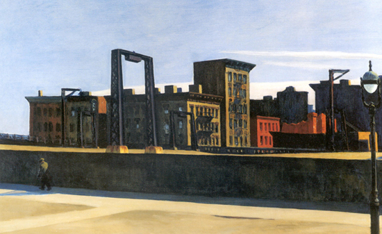 The surreal can be painted as powerful and obvious or it can be represented in more subtle ways. Hopper prefers the latter approach (a kind of suggestion) and paints canvases over which discomfort seeps gradually. They slowly generate a feeling that something is not quite right - that all is not as it at first appears. Take for example Bridge in Paris (1906), Manhattan Bridge Loop (1928), Dawn in Pennsylvania (1942), or Approaching a City (1946). In these paintings the oblique angles, deep shadows, and baroque lighting cast the kind of strange moroseness over his canvases we find in Giorgio di Chirico's Mystery and Melancholy of a Street (1912). The mask-like faces Hopper paints call upon us to enquire as to what may be wrong with this particular woman frozen before a window, or sitting on a bed, or the man who has drifted far away from his desk, or the couple in a trance-like state before the sea. These are not full blown surrealist paintings yet neither are they simple realist works. Later in his career Hopper painted more dream-like and obviously surreal images such as Rooms by the Sea (1951), which shows the sea coming to the very doorstep of a room; and South Carolina Morning (1955) which does the same with a vast expanse of grassland. Both of these paintings challenge the familiar with the oceans of uncertainty which begin at our feet and stretch out across a vast horizon.