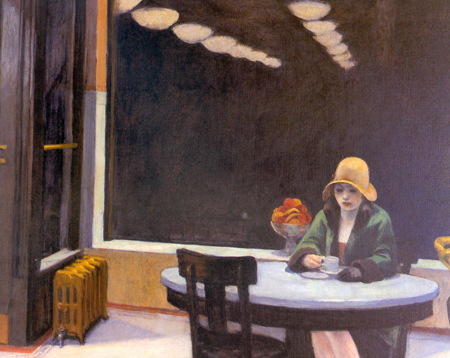 Hopper was a subtle innovator whose work moves further and further away from realism in the way it disenchants America more than we would expect from realism. In Automat (1927) like so many of his pictures [Sunday (1926); Compartment C, Car 193 (1938); Four-lane Highway (1956); Intermission (1963); the cover illustration for the Morse Dial Magazine (1919)], Hopper paints the individual alone in a moment of existential reckoning. These are not happy figures, nor are they outwardly angry. They are in one way or other experiencing American modernity and they do so with a certain indifference. Whether traveling on a train, sitting outside a bypassed gas-station, alone in front of a shop, or in an automat - Hopper paints individuals throughout his career who are not wasting time, but being wasted by it. There are also a number of paintings where more than one person is present but no conversation is taking place such as Chop Suey (1929), Room in New York (1932), Office at Night (1940), Summer Evening (1947), Sea Watchers (1952), Chair Car (1965), or Sunlight in The Cafeteria (1968).